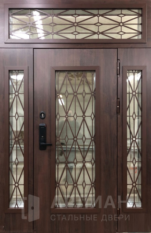 Стальная нестандартная дверь с решеткой и верхней фрамугой №11