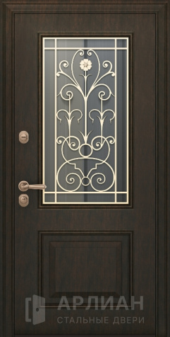Кованая арочная входная дверь со стеклом и ковкой №69